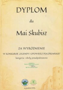 19 grudnia 2025 r.Gratulacje dla Mai Skubisz, która otrzymała wyróżnienie w konkursie Legendy i opowieści pogórzańskie, organizowanym przez Zespół Parków Krajobrazowych w Przemyślu